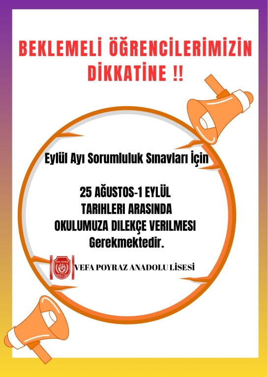 Beklemeli öğrencilerimiz Eylül ayı sorumluluk sınavları için 25 Ağustos - 1 Eylül tarihleri arasında okulumuza dilekçe vermeleri gerekmektedir.